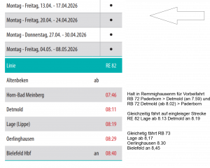 Bielefeld ist an Werktagen frühestens um 6.35 Uhr erreichbar und damit eine Stunde später als normal. Der Grund: Der Zug, der normal um 4.58 Detmold verlässt, wird durch einen Bus ersetzt, der entsprechend länger braucht. Erste Anrufe bei PRO BAHN bestätigen: Das ist für viele Arbeitnehmer aus dem Kreis Lippe existenzgefährdend: Sie können ihren Arbeitsplatz nicht mehr erreichen!