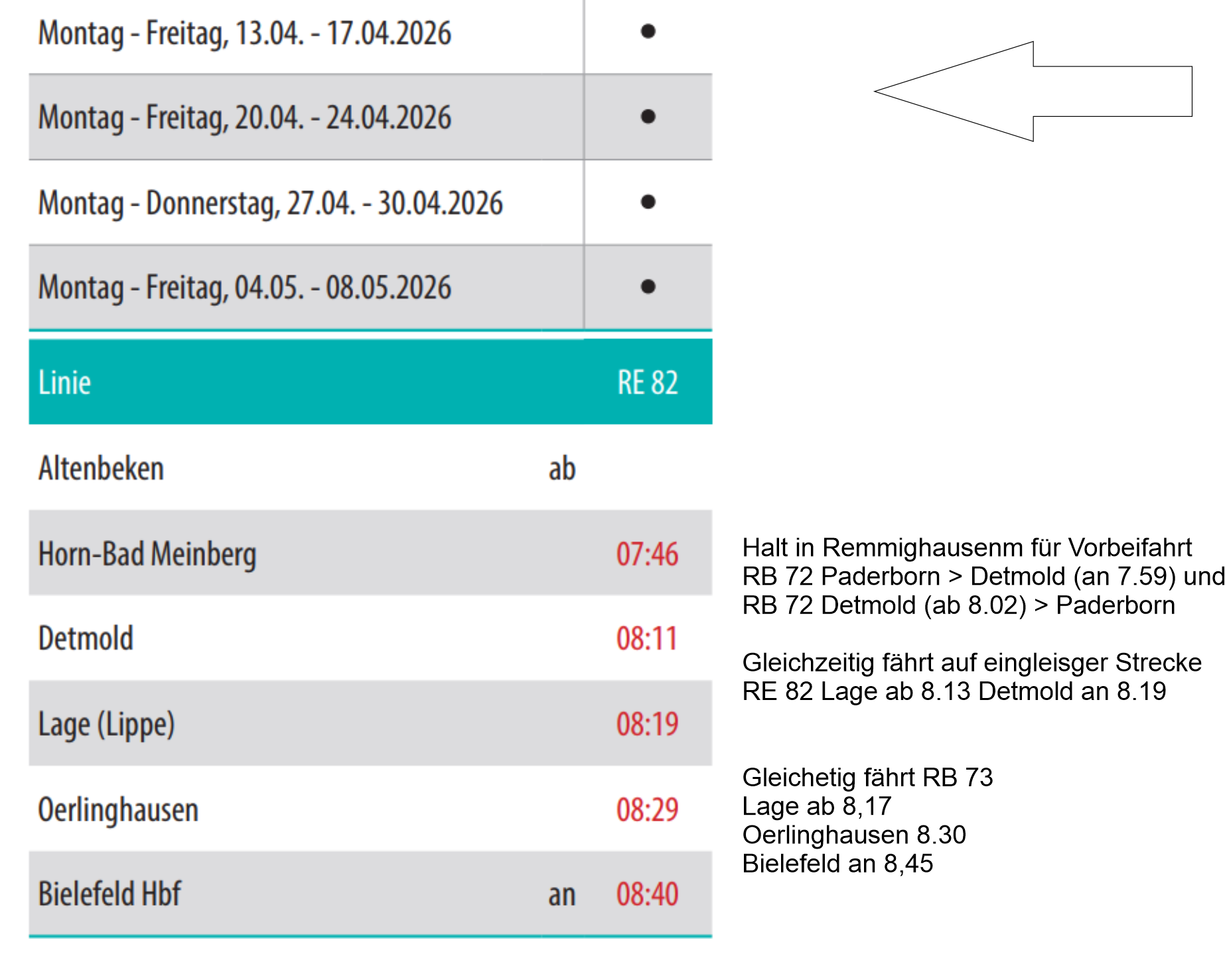 Der groteske Fahrplan gilt aber auch zwischen Horn-Bad Meinberg und Detmold: Der Regionalexpress könnte ganz normal um 7.40 Uhr nach Bielefeld fahren. Die Eurobahn schickt den Zug aber erst nach Horn, damit dort gewendet wird. Von Horn fährt der Zug um 7.46 Uhr ab, kommt aber nur bis Remmighausen. Dort muss erst die Regionalbahn von Paderborn vorbeigelassen werden, die in Horn um 7.51 Uhr abfährt, und dann die Regionalbahn nach Paderborn, Detmold ab 8.02 Uhr. Erst danach geht es weiter, Ankunft ist in Detmold um 8.10 Uhr.