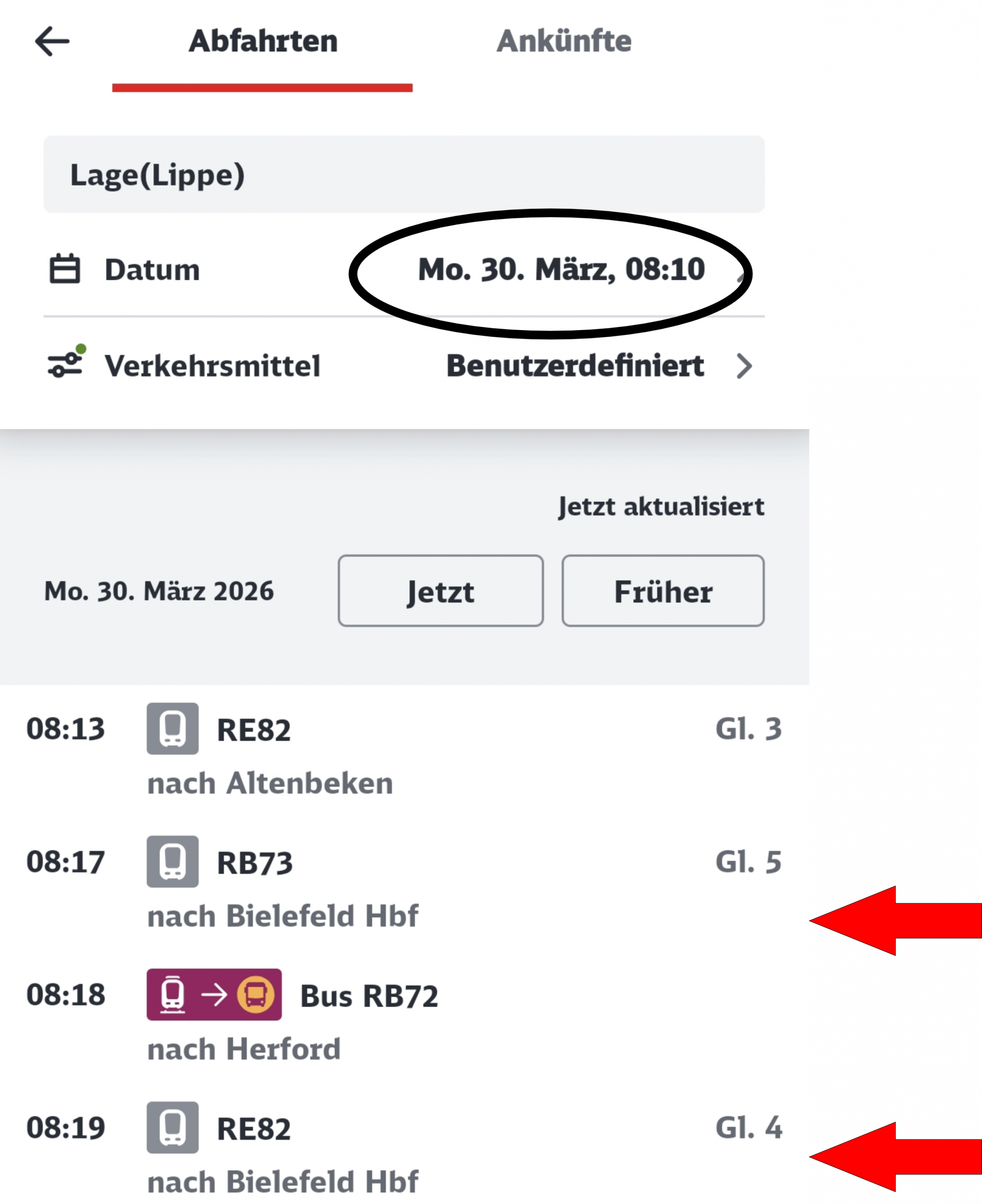 „De letzte gescheite Verbindung besteht von Bielefeld nach Detmold um 20.49 Uhr. Danach fährt zwar, wie immer, die Regionalbahn 73 nach Lage, hat aber keinen Anschluss nach Detmold. Normal kommt nach wenigen Minuten der Regionalzug von Herford, aber der wird durch einen Bus ersetzt. Erst nach geschlagenen 48 Minuten soll der Ersatzbus von Herford kommen. Diese Zeit müssen Fahrgäste, die sich nicht abholen lassen, in Dunkelheit, Kälte und Wind an der Bushaltestelle in Lage verbringen.“